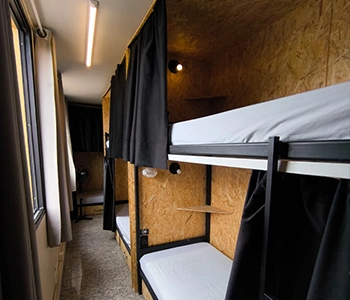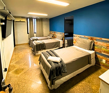 Temos suítes privativas para grupos de até 5 pessoas e quartos compartilhados com até 20 camas. Todas as acomodações contam com ar-condicionado, Wi-Fi gratuito e roupa de cama inclusa.
